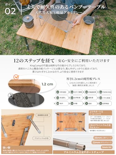 KingCampテーブル 折り畳み無段階高さ調節 超軽量 バンブーテーブル 3折 ロールテーブル 耐荷重30kg コンパクト 収納付き ピクニック携帯便利 75 x 50 x 30-40 cm
